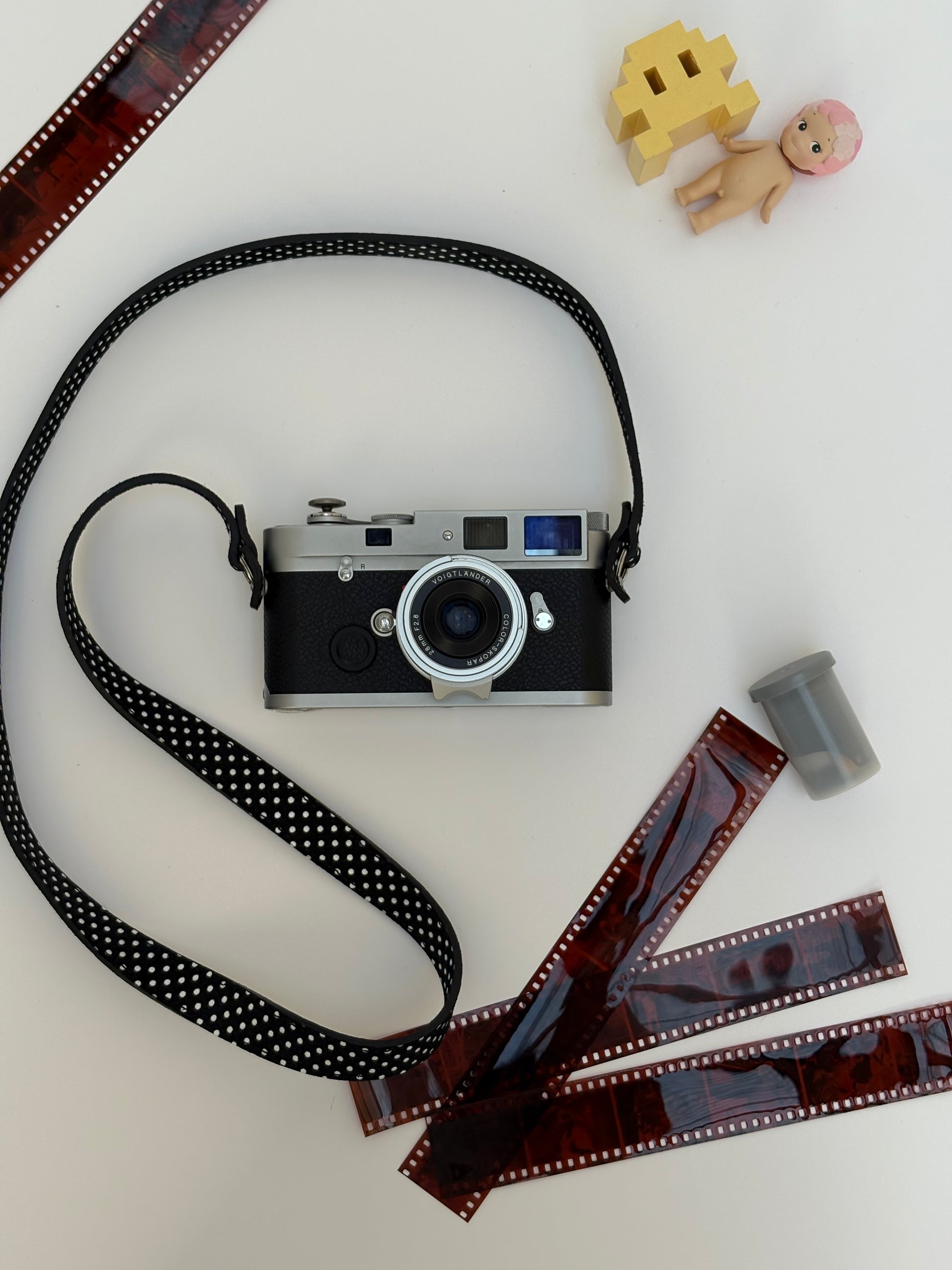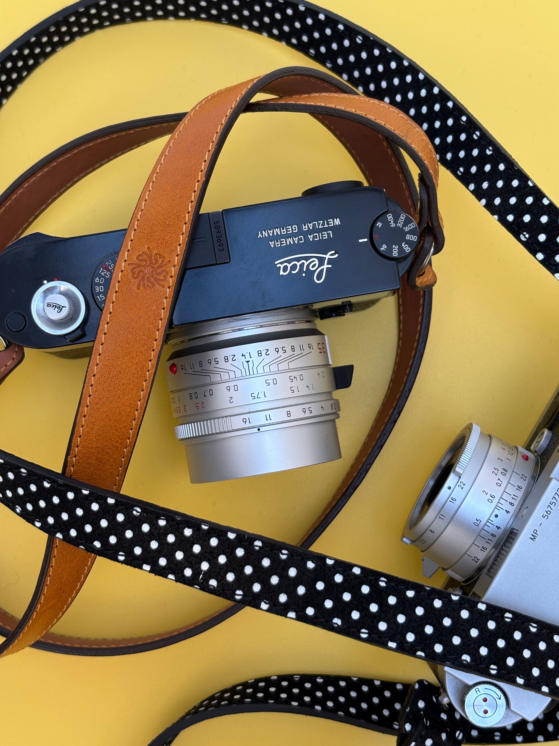 Sangle appareil photo Synastie en cuir de vachette, tannage végétal, fabriquée en France (couleur au choix : noir, camel, ou à pois).